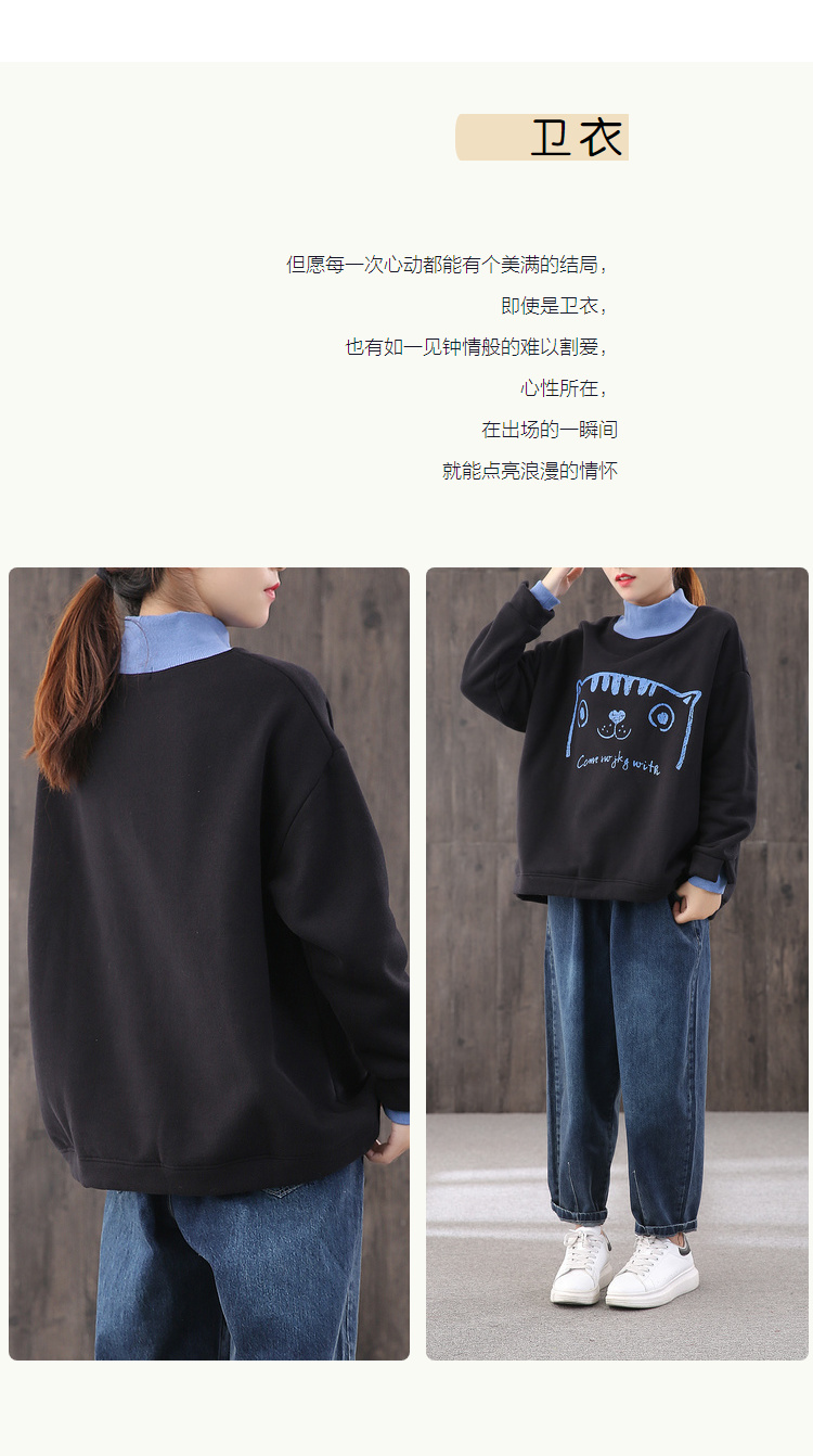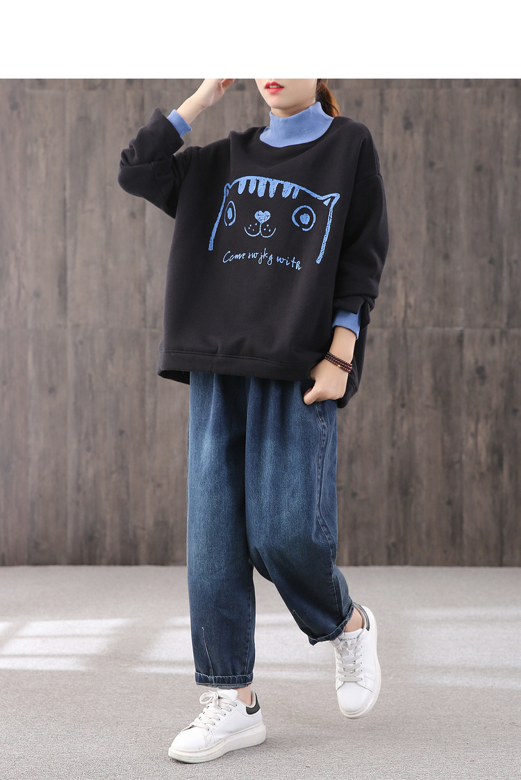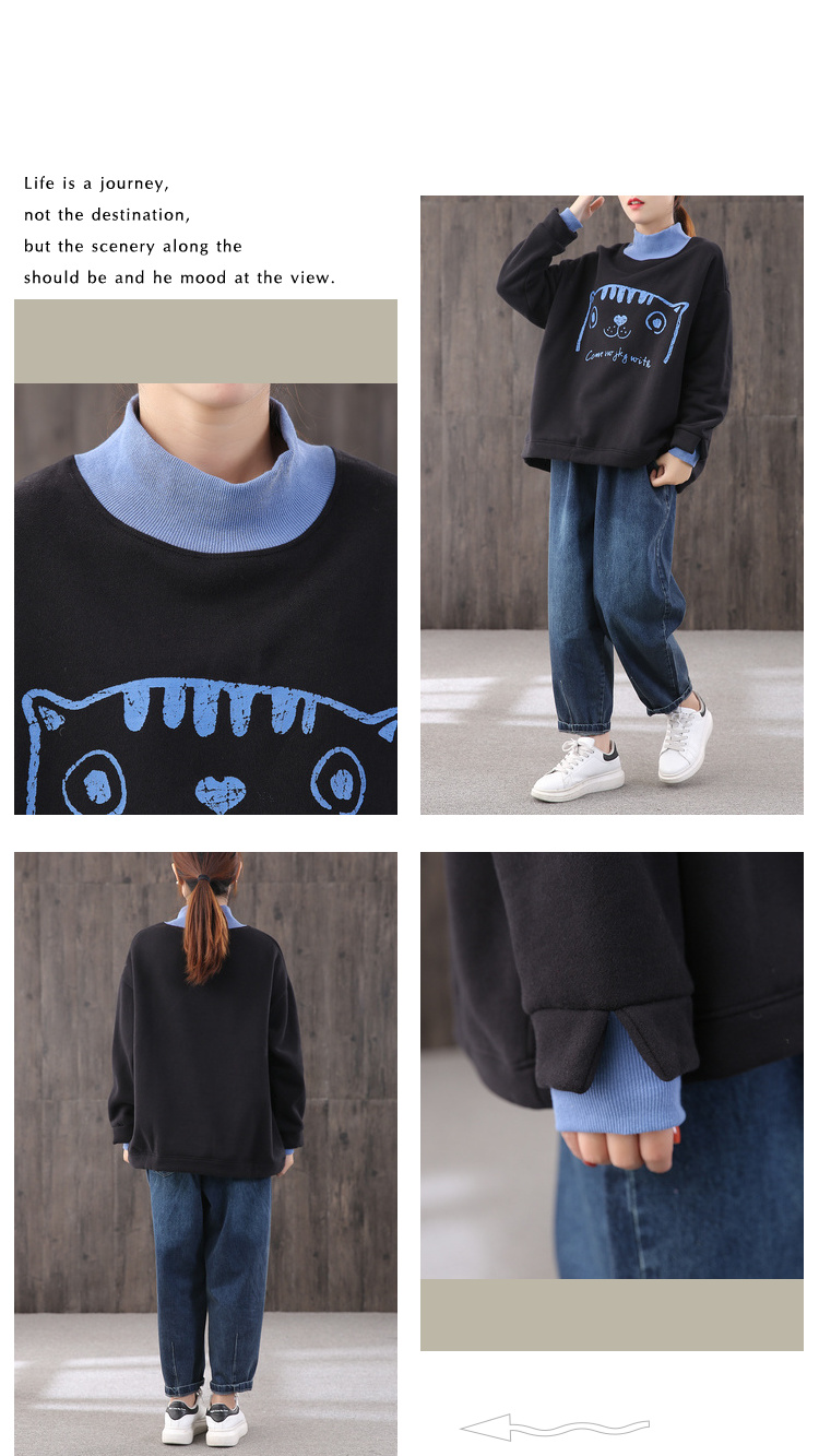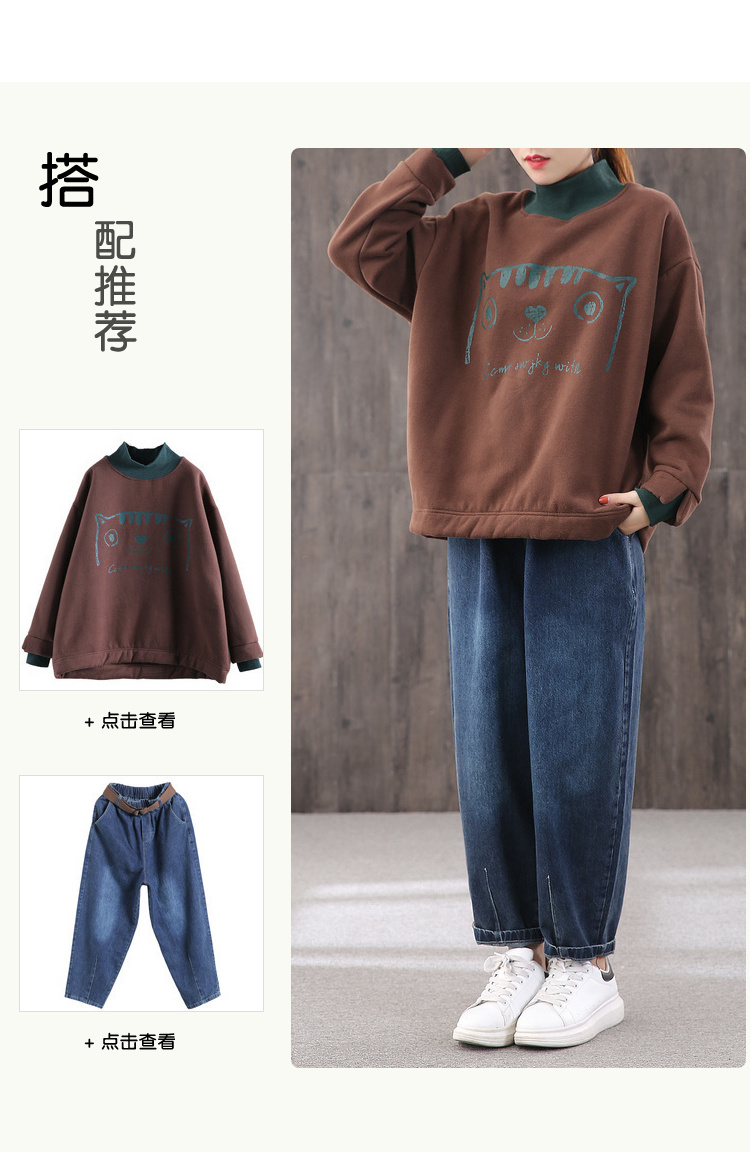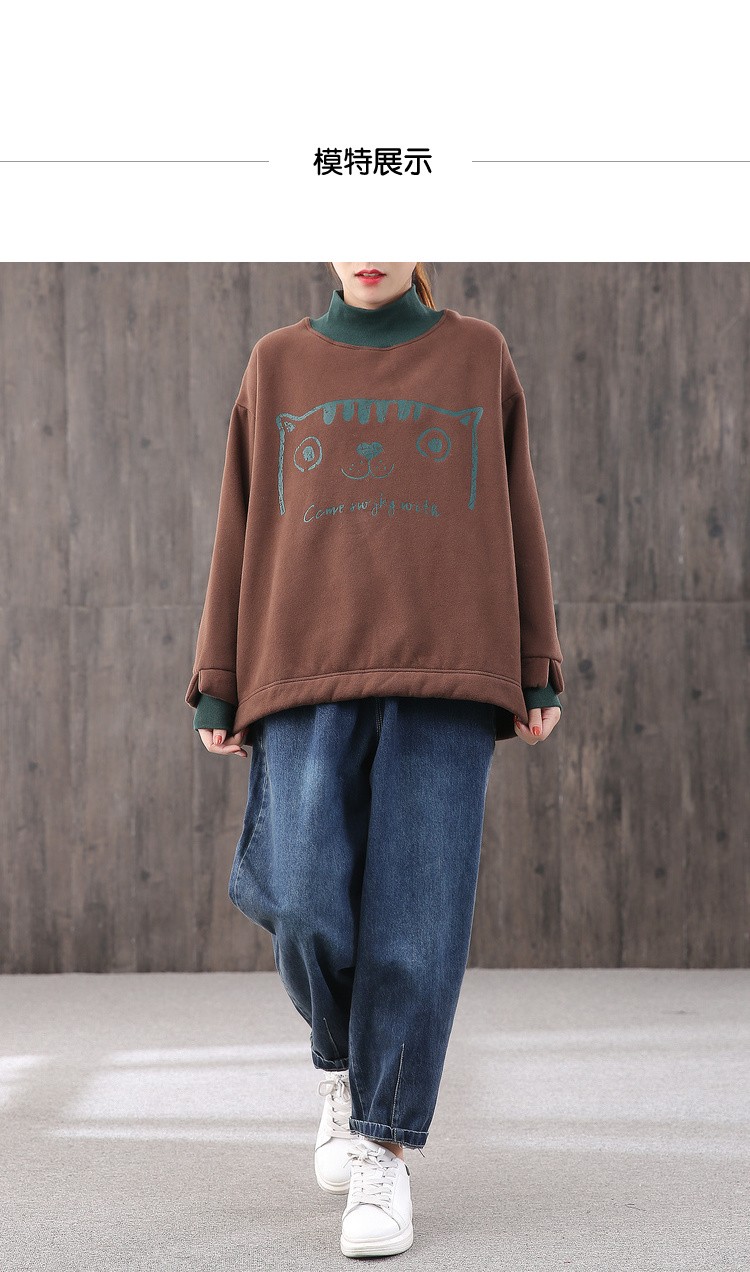 【绿素棉】2020秋冬 宽松休闲加绒大码 卡通高领卫衣女慵懒风上衣